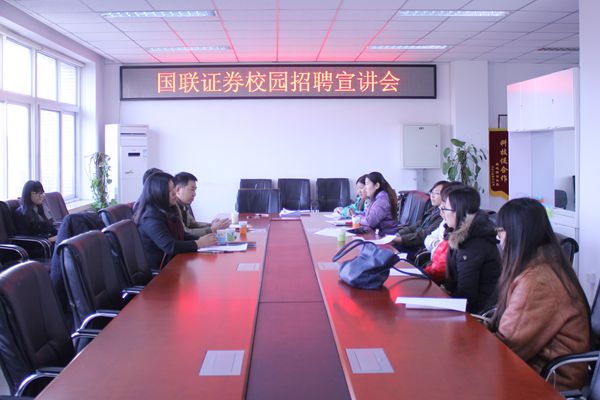 国联证券校园招聘宣讲会于11月30日下午在经管楼401召开。与会人员有国联证券的三位企业代表、经管学院副院长赵金芳老师、13级辅导员乔多老师以及我院国际经济与贸易专业、市场营销专业的大四毕业生。