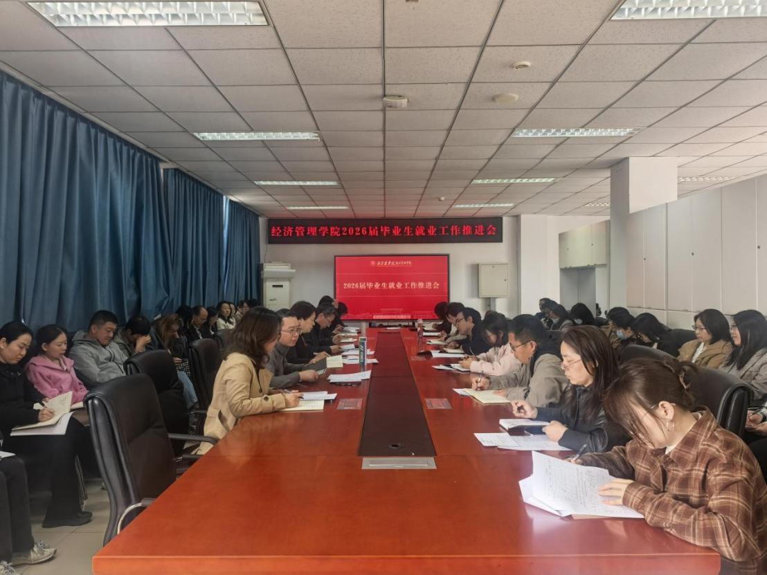 4月14日,经济管理学院召开2026届毕业生就业工作推进会,对就业工作进行再推进、再部署。抢抓春季招聘关键期,打好就业攻坚战,全力促进学院2026届毕业生高质量充分就业。学院全体教职工参会,会议由学院党委书记刘芳主持。