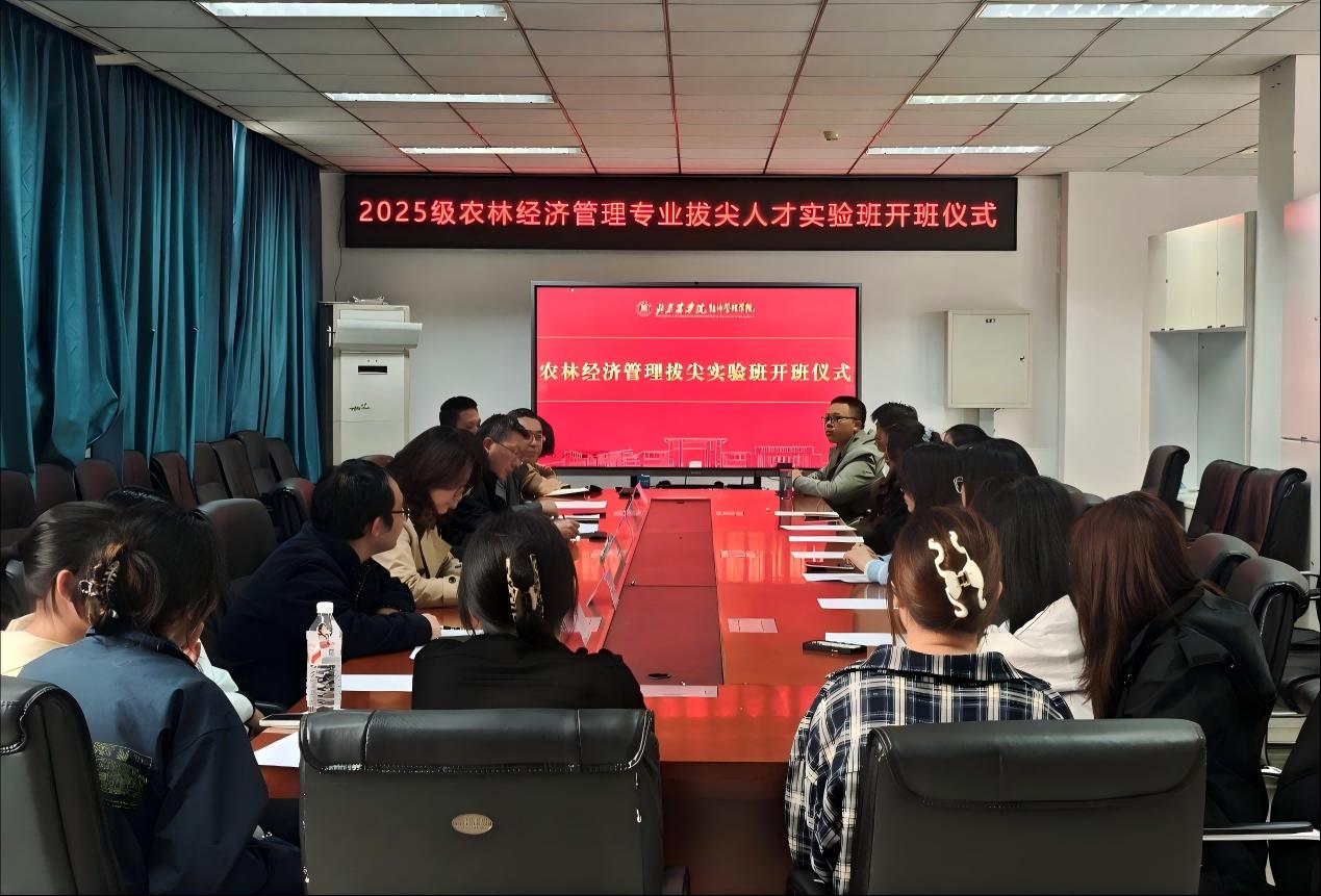2026年4月14日,经济管理学院2025级农林经济管理拔尖实验班开班仪式在经管楼401会议室举行。经济管理学院院长刘铁军、学校教务处副处长赵汗青、经济管理学院副书记、副院长郝娜、副院长徐广才、农经系主任黄雷、实验班班主任朱然以及实验班18名同学参加开班式。开班仪式由副院长徐广才主持。