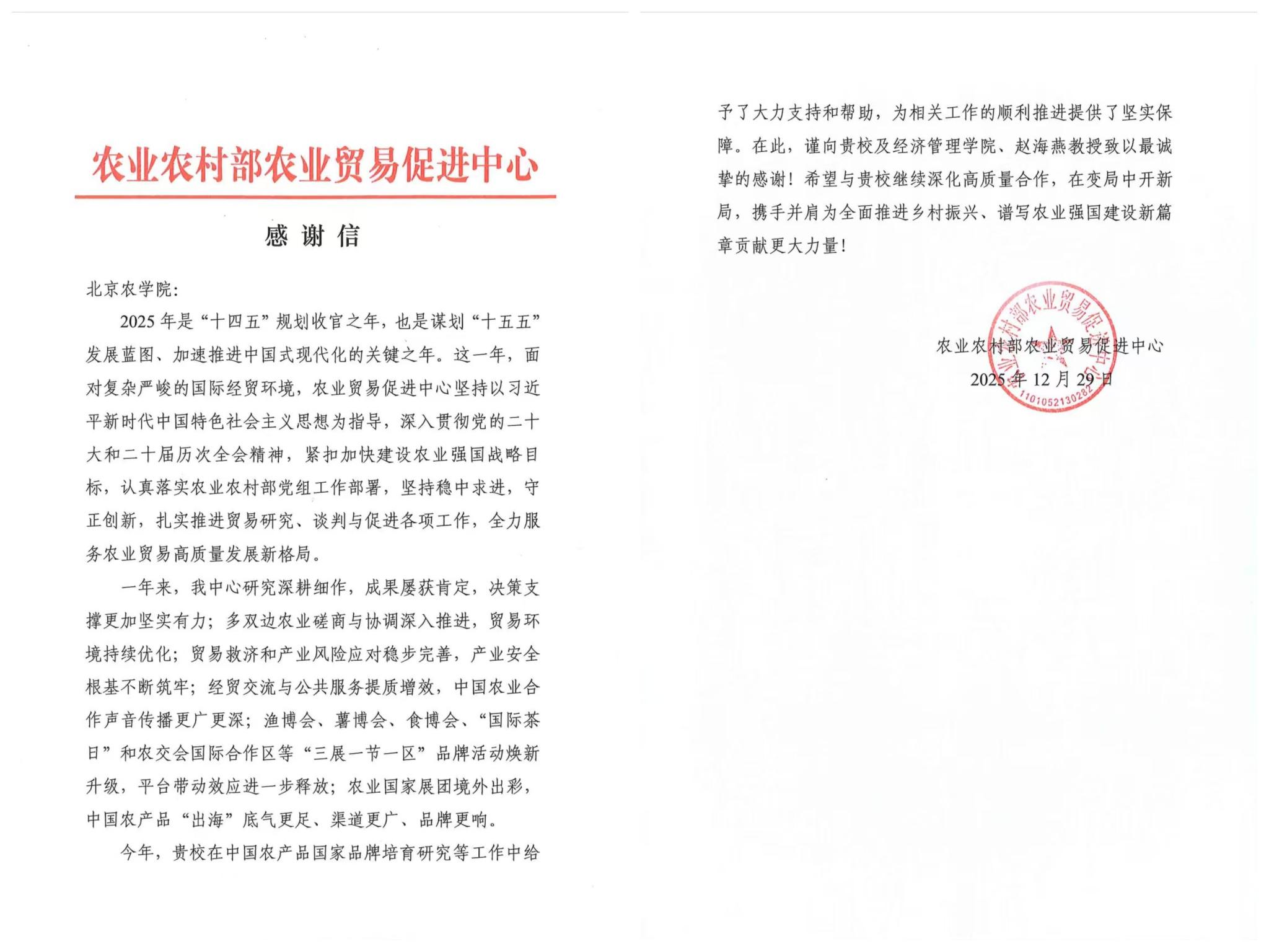 信中指出,在相关工作推进期间,赵海燕教授团队给予了多方支持与协助,为工作的顺利开展提供了坚实保障,为促进我国农业贸易高质量发展添砖加瓦。此次合作充分展现了北京农学院经济管理学院极强的责任担当与高效的执行能力,展望未来,农业农村部农业贸易促进中心期待与我院持续深化高质量合作,在变局中开拓新局,携手并肩共同为全面推进乡村振兴、谱写农业强国建设新篇章贡献更大智慧与力量。