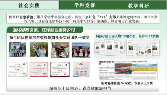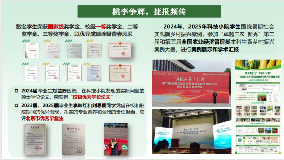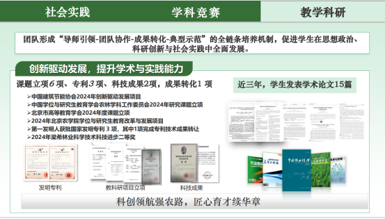 育人润心,是她关爱学生成长的赤诚初心。作为硕士生导师,她始终坚持“以生为本”,注重学生综合素质的培养与价值观的塑造。团队形成“导师引领-团队协作-成果转化-典型示范”的全链条培养机制,促进学生在思想政治、科研创新与社会实践中全面发展。所带学生多人荣获国家奖学金、各级学业奖学金,以优异成绩展现青春风采。2022—2025年,研究生团队发表学术论文20余篇,2名学生获评研究生国家奖学金、12名学生获校级一二三等奖学金、2名学生获北京农学院优秀硕士学位论文、2名研究生获北京市“优秀毕业生”等荣誉称号,在服务乡村振兴中解民生、治学问,实现了学术成果和实践能力的双丰收。指导研究生过程中,她既以严谨治学态度要求学生深耕学术,又以细致入微的关爱温暖学生成长之路。学生眼中的她,老师就像一位大家长一样,师门的所有兄弟姐妹像一个个被保护的孩子,在学习科研和生活态度上受益颇多。在她的影响下,所带学生毕业后,许多学生积极响应国家号召,投身“三支一扶”计划,扎根基层一线,为乡村振兴和生态文明建设贡献青春力量;亦有学生走上中华合作时报、农民日报要闻编辑记者岗,深耕“三农”沃土;还有学生选择回到校园,成为北京市园林学校的教师,接过教鞭,续写农教华章,生动诠释了“明师之恩,诚为过于天地”的深厚师生情谊。