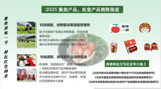 科技小院初建时,当地温室以叶菜种植为主,附加值低、竞争力弱,设施条件还尚薄弱。刘笑冰老师带领学生转向西红柿、草莓等高效经济作物,反复试验定制型栽培基质配方,获批多项国家发明专利,探索出适地高效的现代化园艺作物生产模式。2023年,面对小院低质林地还耕复垦难题,她带领学生调研土壤状况、谋划三产融合路径,鼓励学生以实际需求为毕业论文研究方向,在实践中深化对“绿水青山就是金山银山”的理解。2024年,小院迈入产学研融合快车道。刘笑冰教授带领学生考察调研、试验新型绿色低碳基质,成功打造鲜食玉米特色品牌,引导学生聚焦产业痛点和消费者需求开展研究,让科研成果服务产业发展。2025年,团队聚焦科技小院“原味一号”西红柿提质增效、品牌建设和市场潜力研究,针对其优质难优价的瓶颈,优化栽培基质配方,开展消费者调研,重塑客户画像,提升产品供需匹配度,构建品牌体系,拓展社区团购、直播带货等多元渠道,相关研究为产业发展提供科学决策依据。